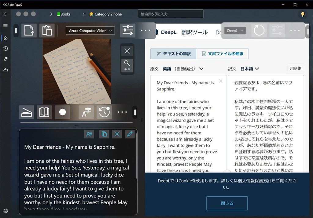 アプリ内の翻訳サービス管理ページに登録することで、DeepL翻訳なども利用可能です。