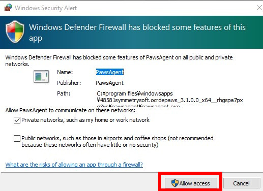 When firewall has blocked and is shown alert message, select 'Allow access' button.