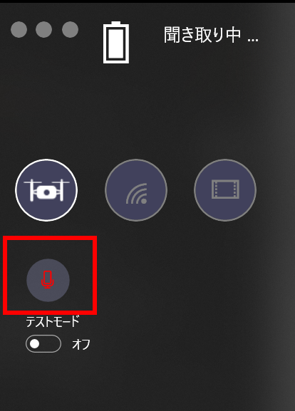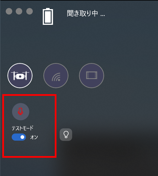 ③Droooneアプリで音声認識のテストモードをONにし、音声認識が正常に行えることを確認する。確認後はテストモードをOFFにする。(VR空間で音声認識を利用するには、現実の世界で音声認識を利用できていることが前提として必須)