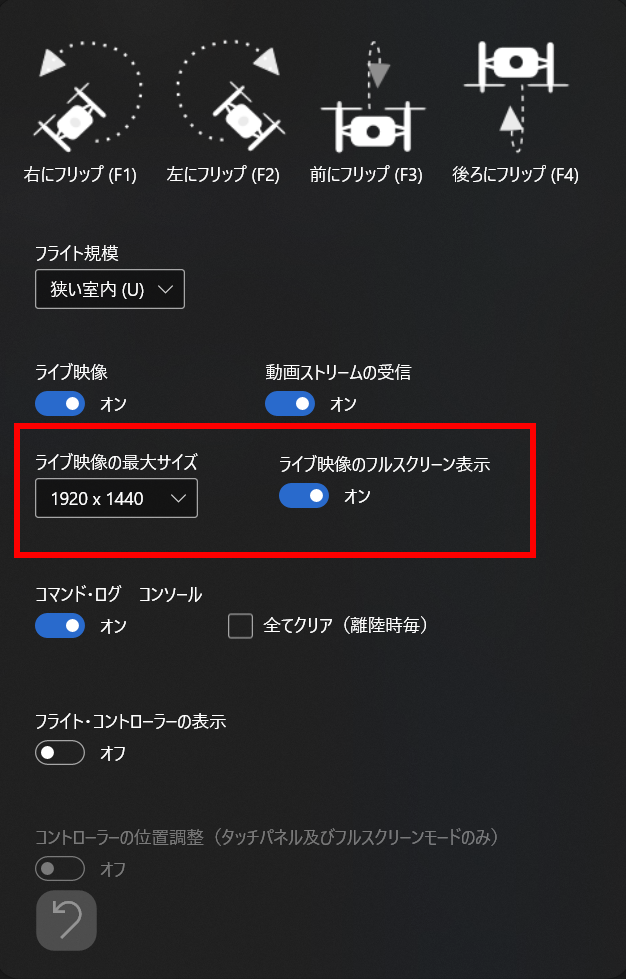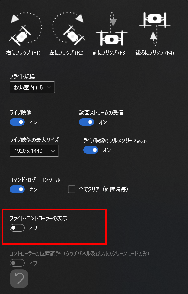 ②サブパネルで、フライト・コントローラーの表示スイッチをOFFにする。