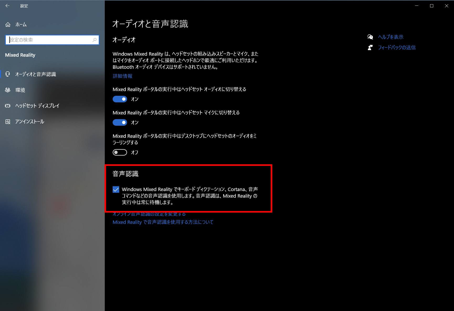 ②「オーディオと音声認識」で音声認識が有効になっていることを確認する。