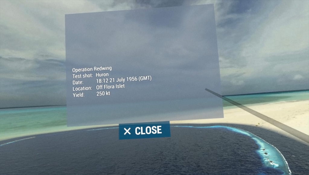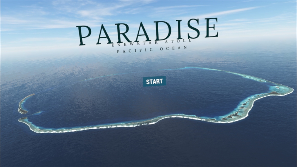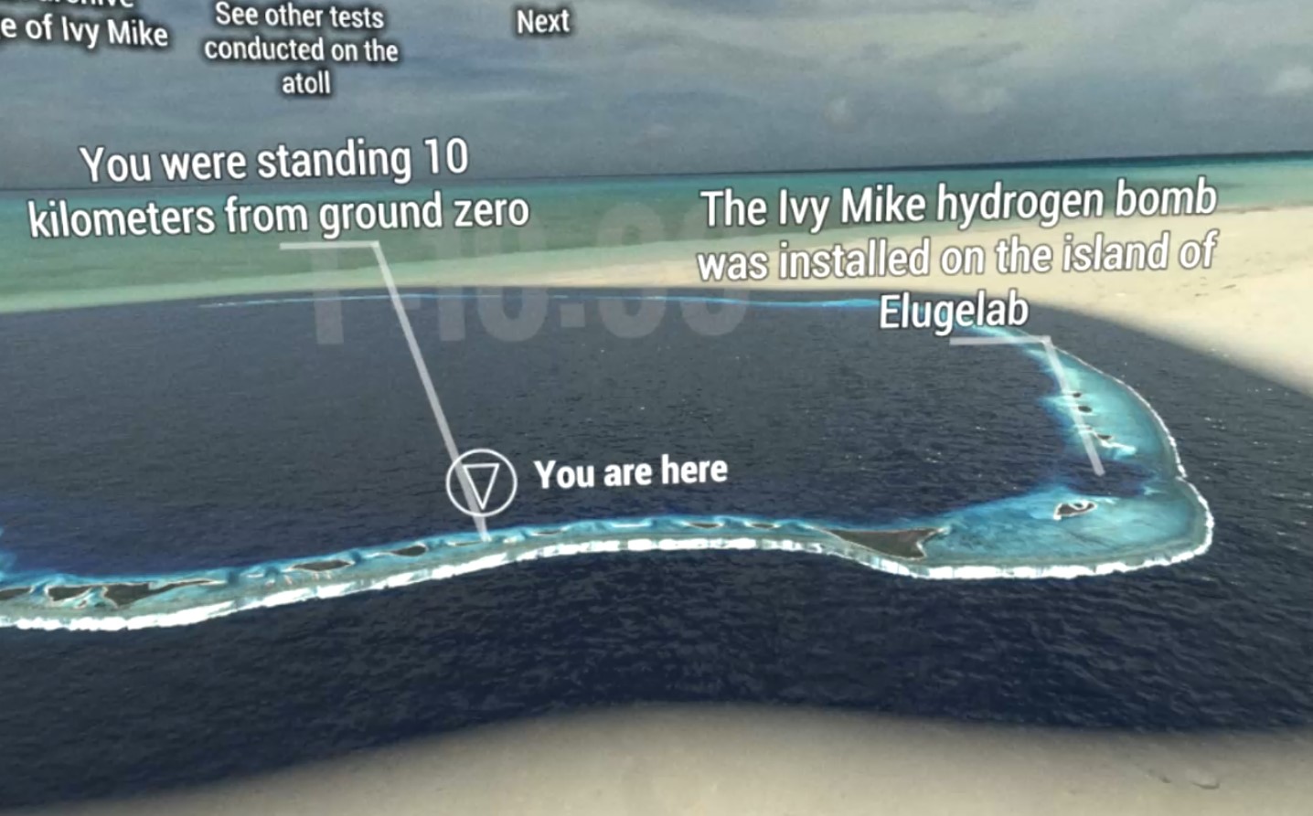 核爆弾は、エニウェトク環礁にあるエルゲラブ島(Island of Elugelab)に設置されました。シミュレーションではその地点(ground zero)から、10Km離れた地点に立ちます。そしてこの地点で、水素爆弾実験を仮想体験することになります。