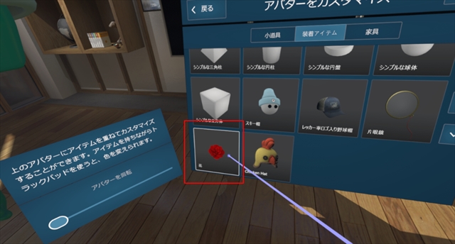 装着アイテムからバラの花を選択し、アバターの頭に装着してみましょう。