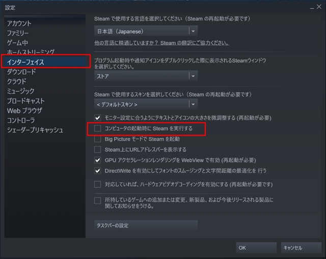次に、インターフェスの設定で「コンピューターの起動時にSteamを実行する」のチェックを外します。