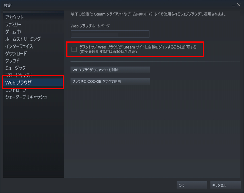 また、WEBブラウザの設定で「Steamサイトに自動ログイン」を無効にします。