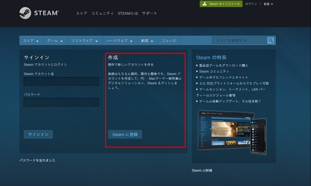 なお、既にSteamのアカウントを持っている方は、不要な手順を省略して下さい。