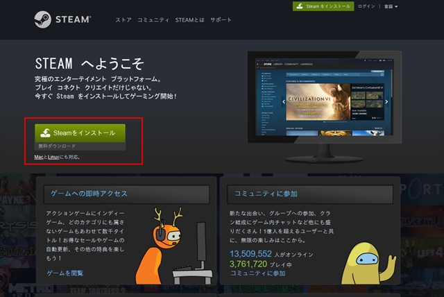 「Steamをインストール」をクリックし、SteamSetup.exeをダウンロードします。