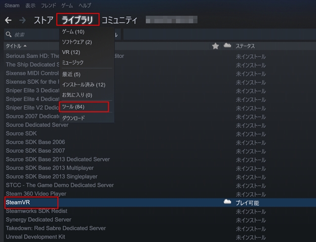 手順2でインストールを行ったSteamアプリを起動し、「ライブラリ」メニューの「ツール」を選択します。