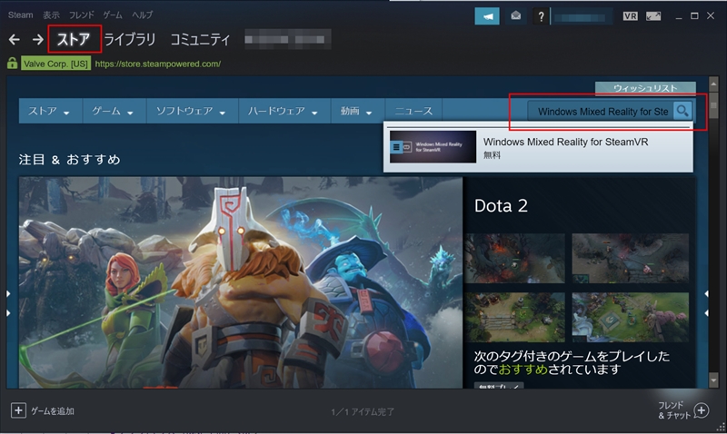 Steamアプリの「ストア」画面で、検索ボックスに「Windows Mixed Reality for SteamVR」と入力し検索実行します。