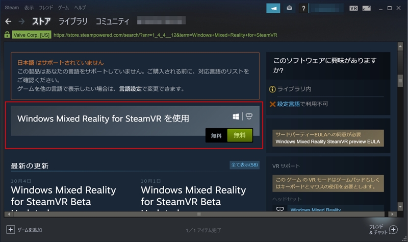Windows Mixed Reality for SteamVRを使用の「無料」をクリックしインストールを行って下さい。
