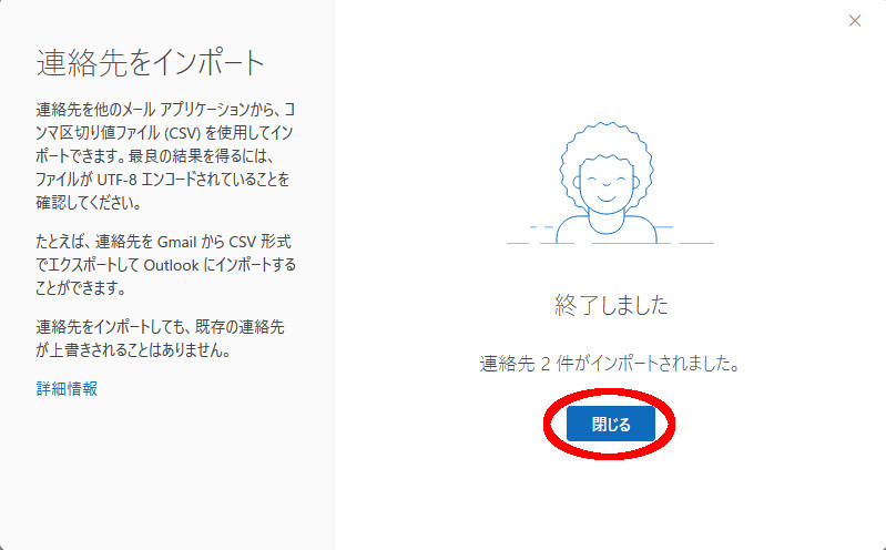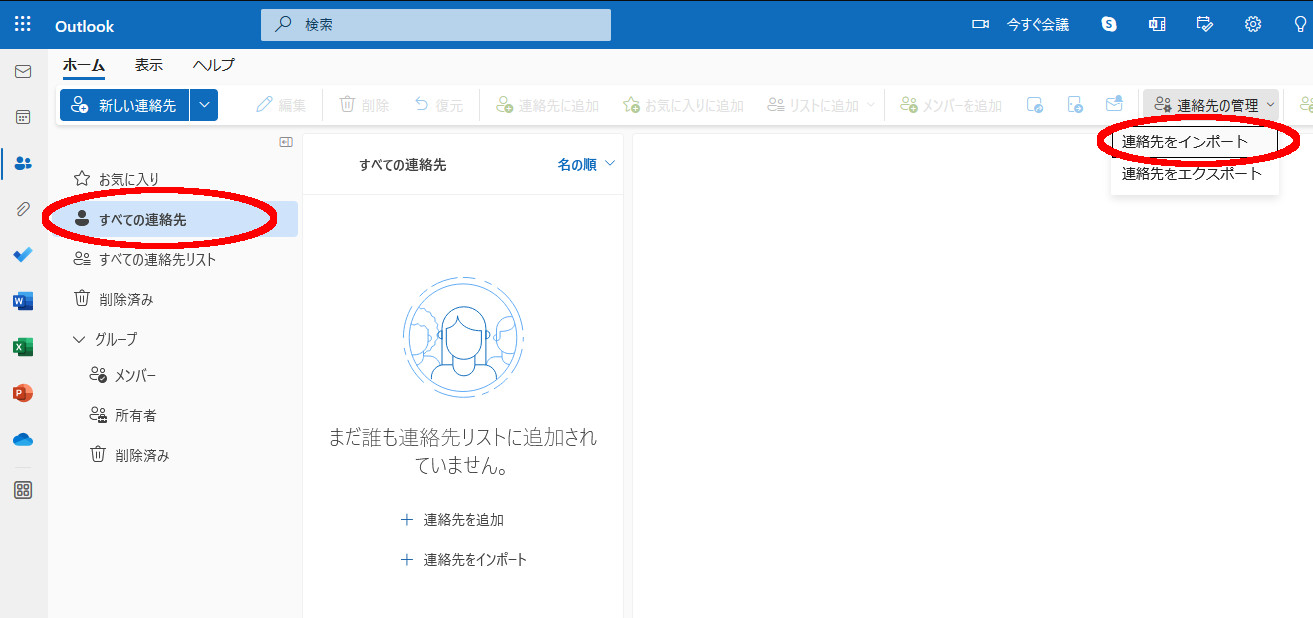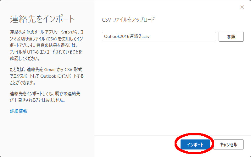 ④ 上記③で出力したCSVファイルをOutlook.comの「連絡先の管理」でインポートする。