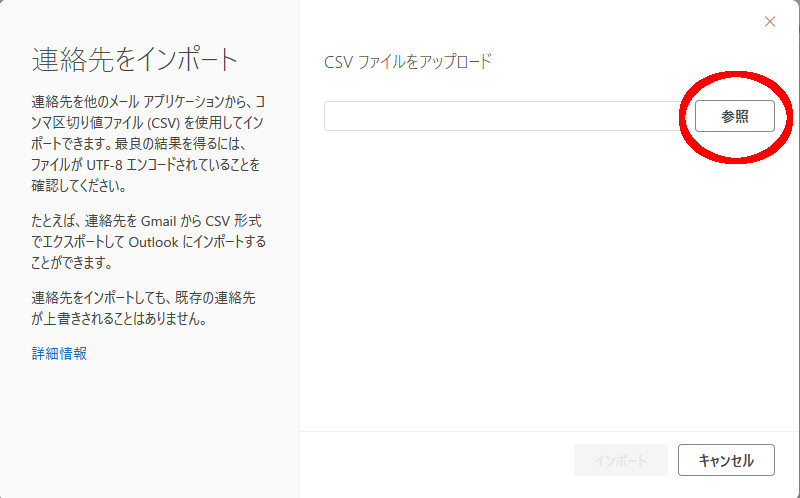 ⑤インポートを行うCSVファイルを参照する。(UTF-8のみ対応)