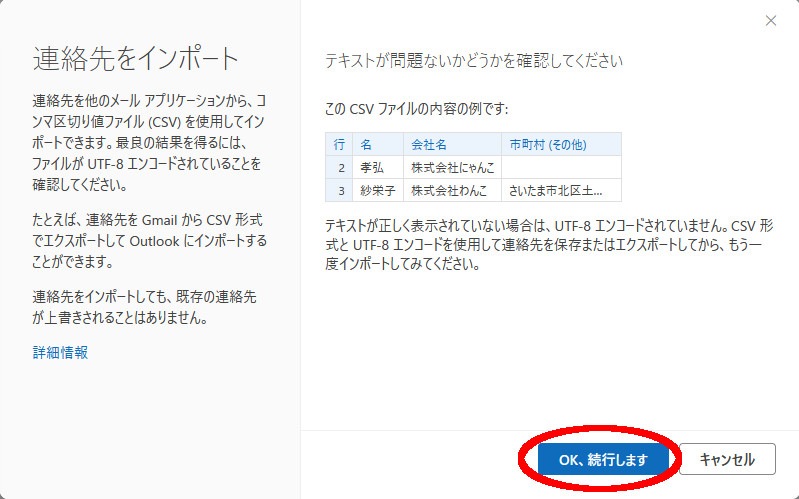 ⑦データが文字化けなどしないか確認し、問題が無ければ「OK、続行します」をクリックする。