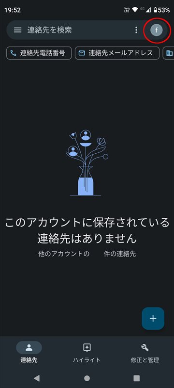 ①画面上部左に表示されたアカウントのアイコンをタップする。