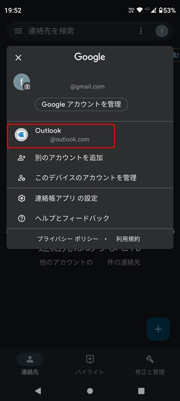 ④Androidの連絡帳アプリでOutlookアカウントを選択できれば設定完了です。
