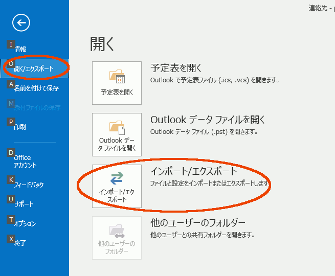 ①Outlook 2016連絡先の「ファイルメニュー」から「開く/エクスポート」の「インポート/エクスポート」ボタンをクリックする。