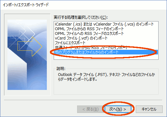 ②実行する処理で「他のプログラムまたはファイルからのインポート」を選択し、「次へ」ボタンをクリックする。