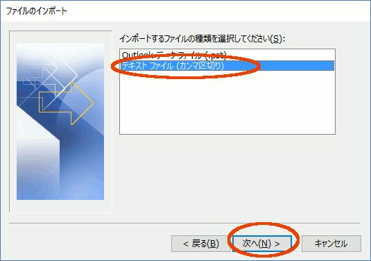 ③インポートするファイルの種類で「テキストファイル(カンマ区切り)」を選択し、「次へ」ボタンをクリックする。