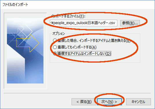④参照でインポートするファイルを選択し、任意のオプションを選択後「次へ」ボタンをクリックする。