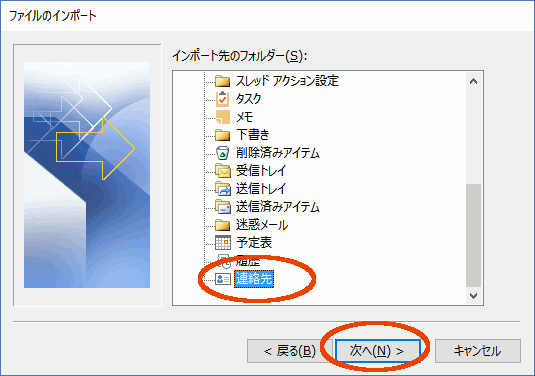 ⑤インポート先のフォルダで「連絡先」を選択し、「次へ」ボタンをクリックする。