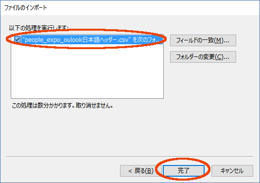 ② 上記①で出力したCSVファイルをOutlook 2019の連絡先にインポートする。