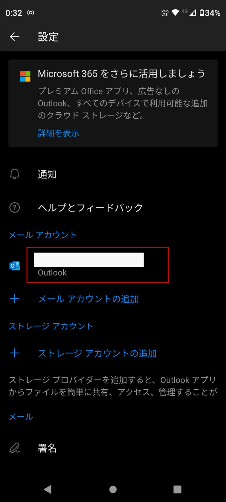 ②Outlookアカウントを選択する。Outlookアカウントが表示されていない場合は、「Outlookと同期」を行う。