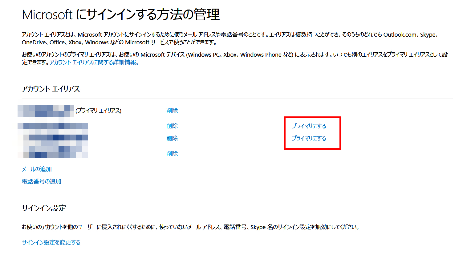 ①セカンダリ エイリアスの作成で説明した「Microsoftにサインインする方法の管理」で、プライマリにしたいメールアドレス行の「プライマリにする」を選択する。