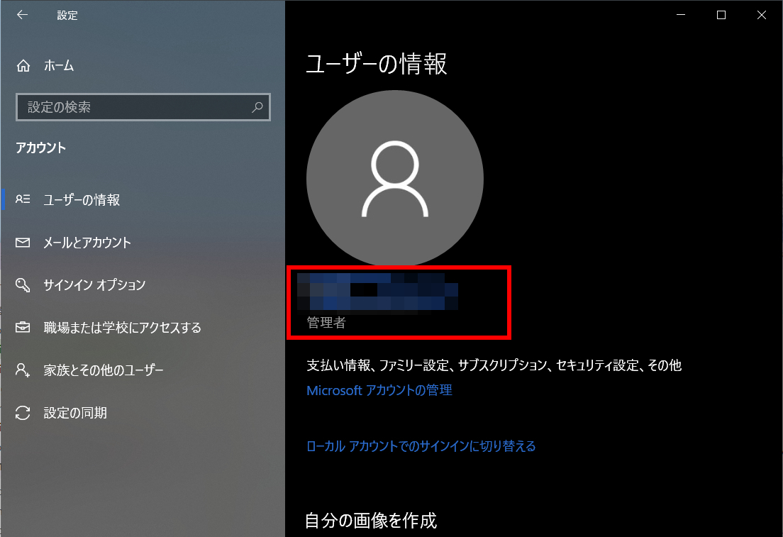 ①OSの設定で「アカウント」>「ユーザーの情報」を選択し、管理者が新しいプライマリ エイリアスに変更されていることを確認する。