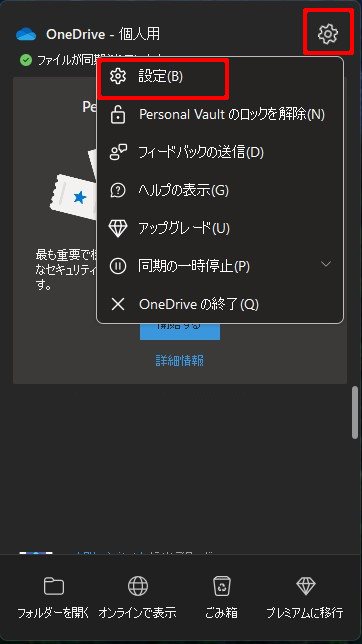 ①タスクバーの通知領域でOneDriveのアイコンを右クリックし、設定を選択する。