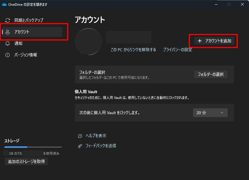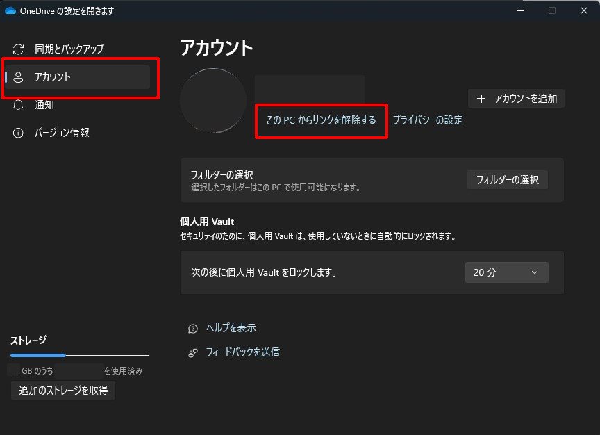 ②「アカウント」タブで「このPCのリンク解除」を選択し古いプライマリ エイリアスの同期を停止する。