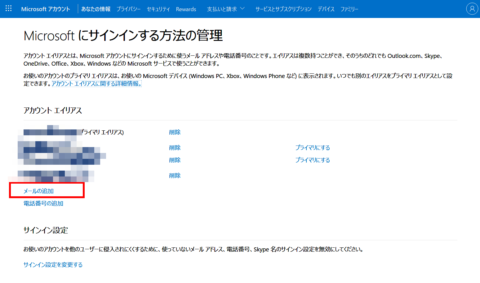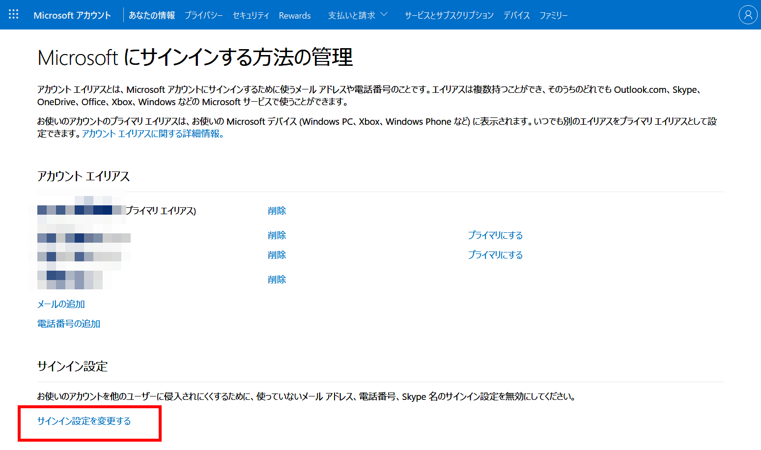 プライマリ変更を行った後や、サインインできるエイリアスを変更したい場合は、サインイン設定で確認及び変更できます。