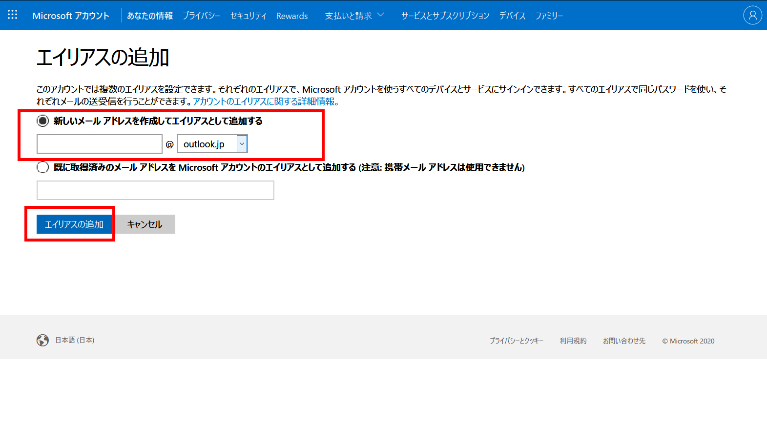 Microsoftアカウントを新規作成した状態では、プライマリ エイリアスが一つだけ提供されます。