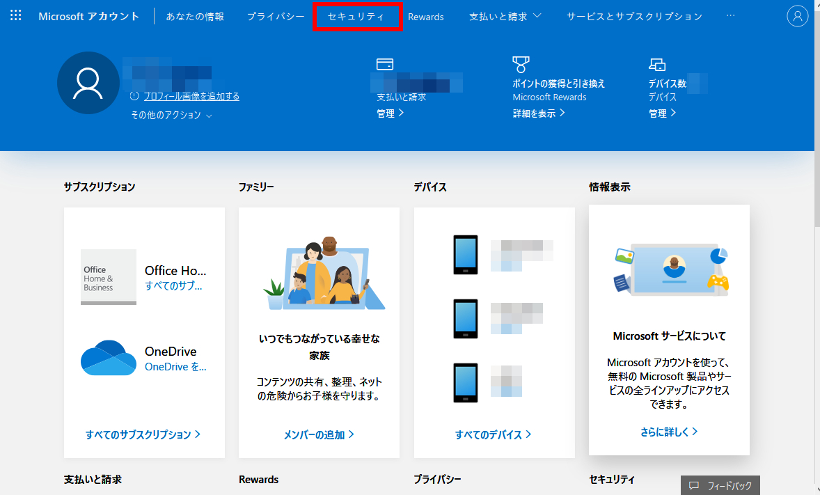 ①Microsoftのアカウント・ダッシュボードにサインインする。