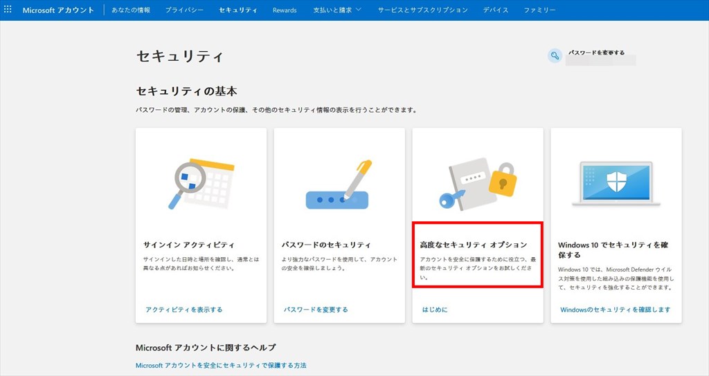 ①アカウント・ダッシュボードの「セキュリティ」>「高度なセキュリティ オプション」を選択する。