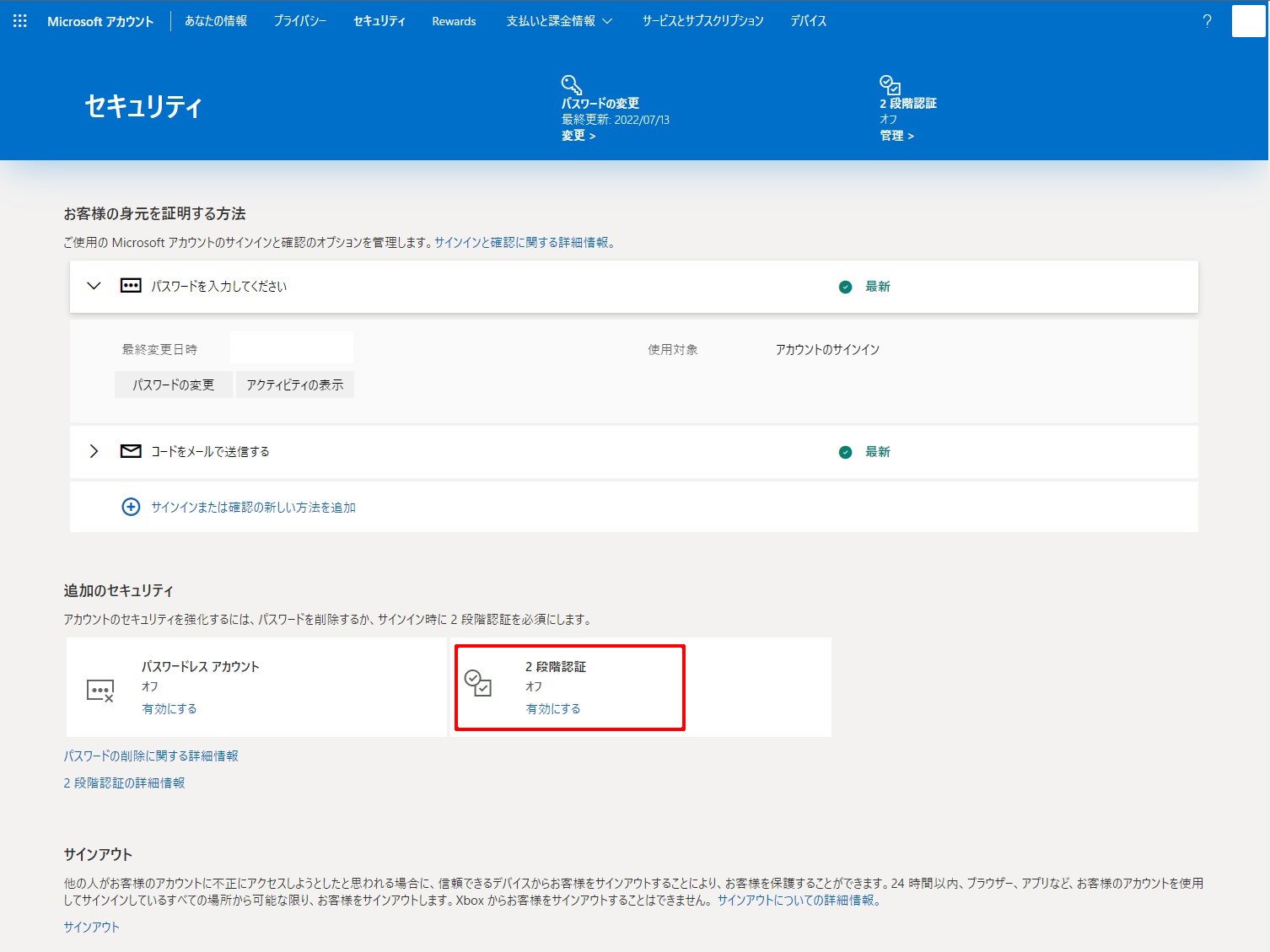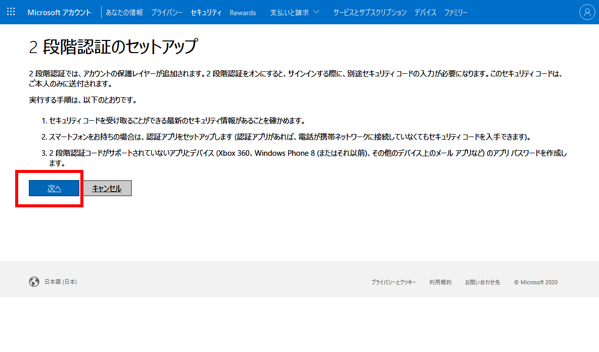 Microsoftアカウントのセキュリティ対策として、今では当たり前になっている2段階認証機能も利用できます。
