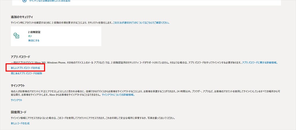 ②「アプリ パスワード」の「新しいアプリ パスワードの作成」を選択する。