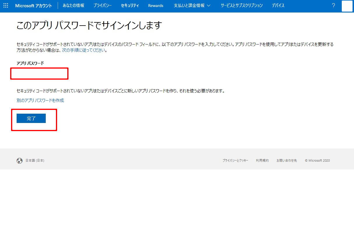 その対応策として、ランダムに生成されるアプリ パスワードを入力するようにしましょう。