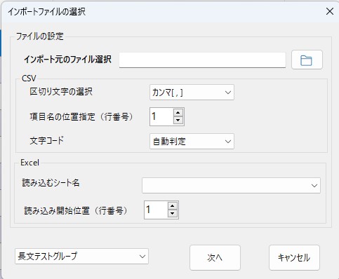 選択したファイル種別に応じて、CSVまたはExcelの各項目を設定し、「次へ」を実行する。