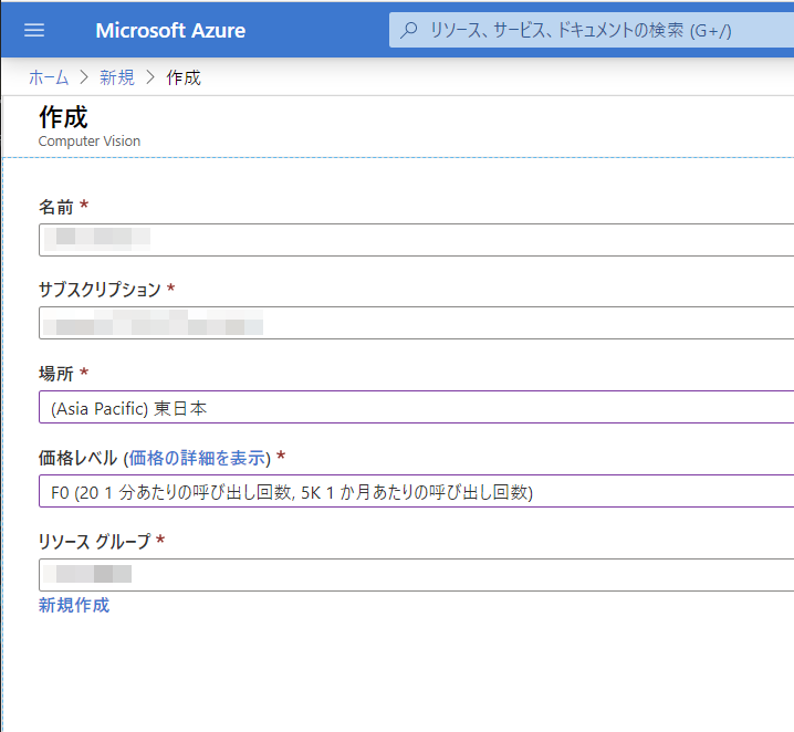 価格レベルとしてFree(F0)を選択する。サブスクリプションやリソースグループは作成済みの名称を指定する。