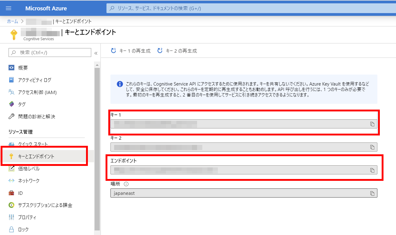 デプロイ完了後に「キーとエンドポイント」ページに遷移し、エンドポイントとAPIキーを取得する