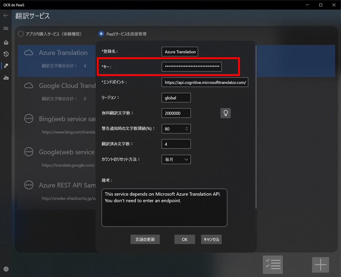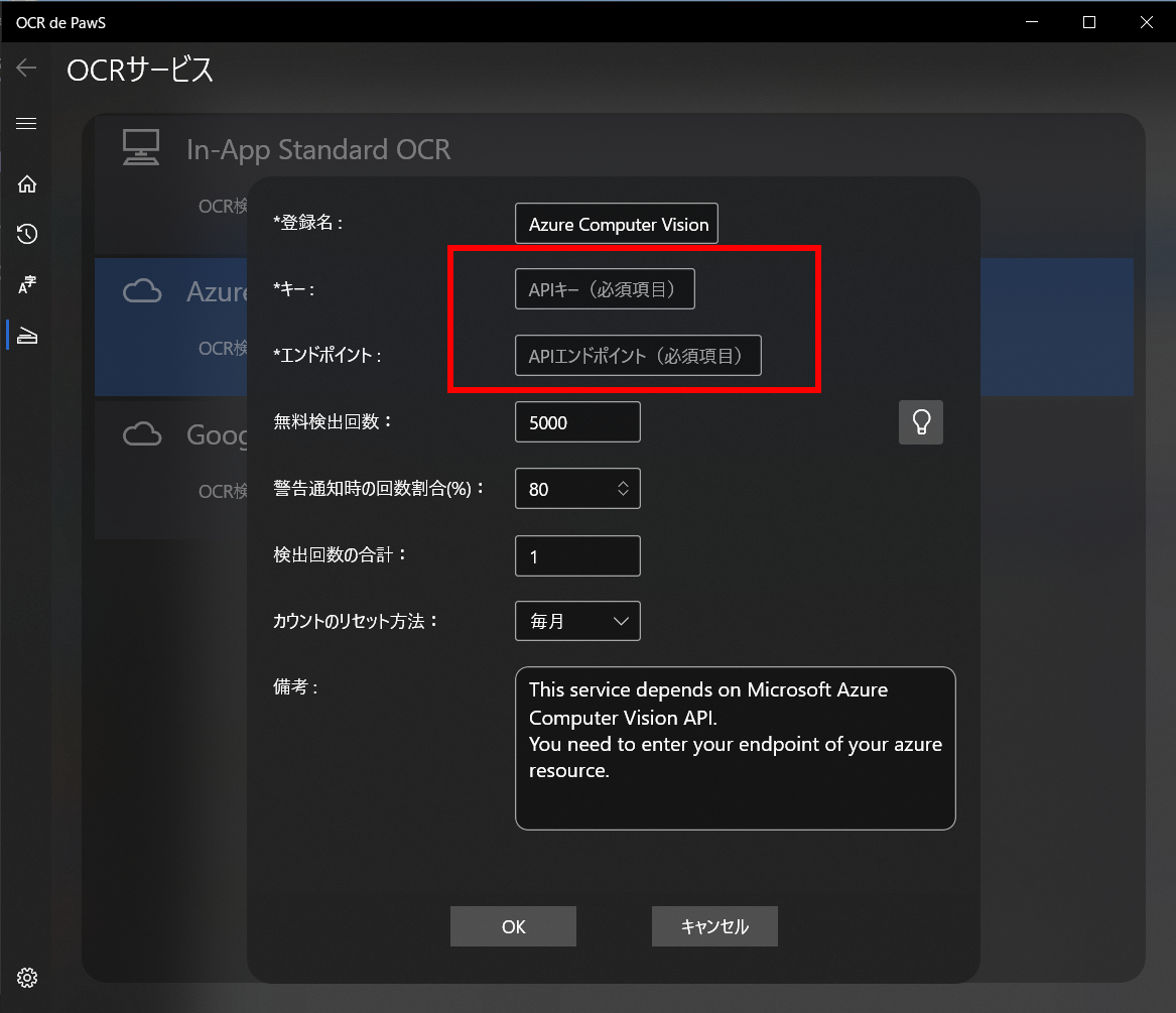 取得した情報をOCR de PawSに設定する。OCRサービス管理ページのAzure Computer Visionを選択し、APIキーとエンドポイントを登録すれば完了。