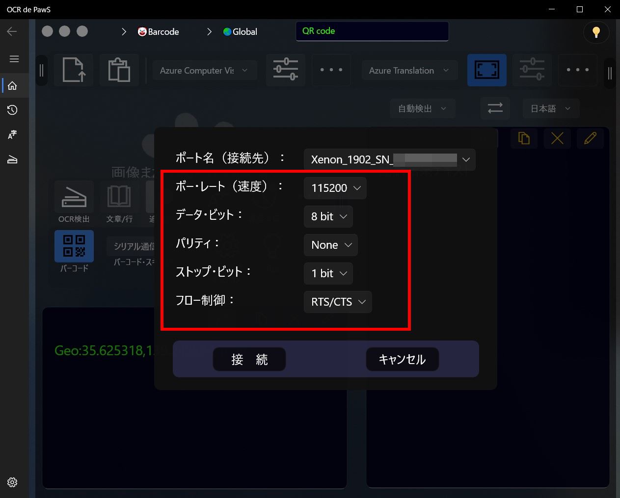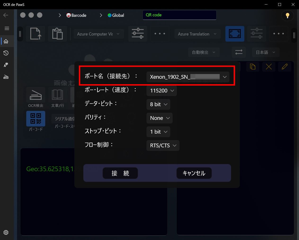 OCR de PawSのシリアル通信接続パネルのポート名(接続先)リストには、次の様に表示されます。