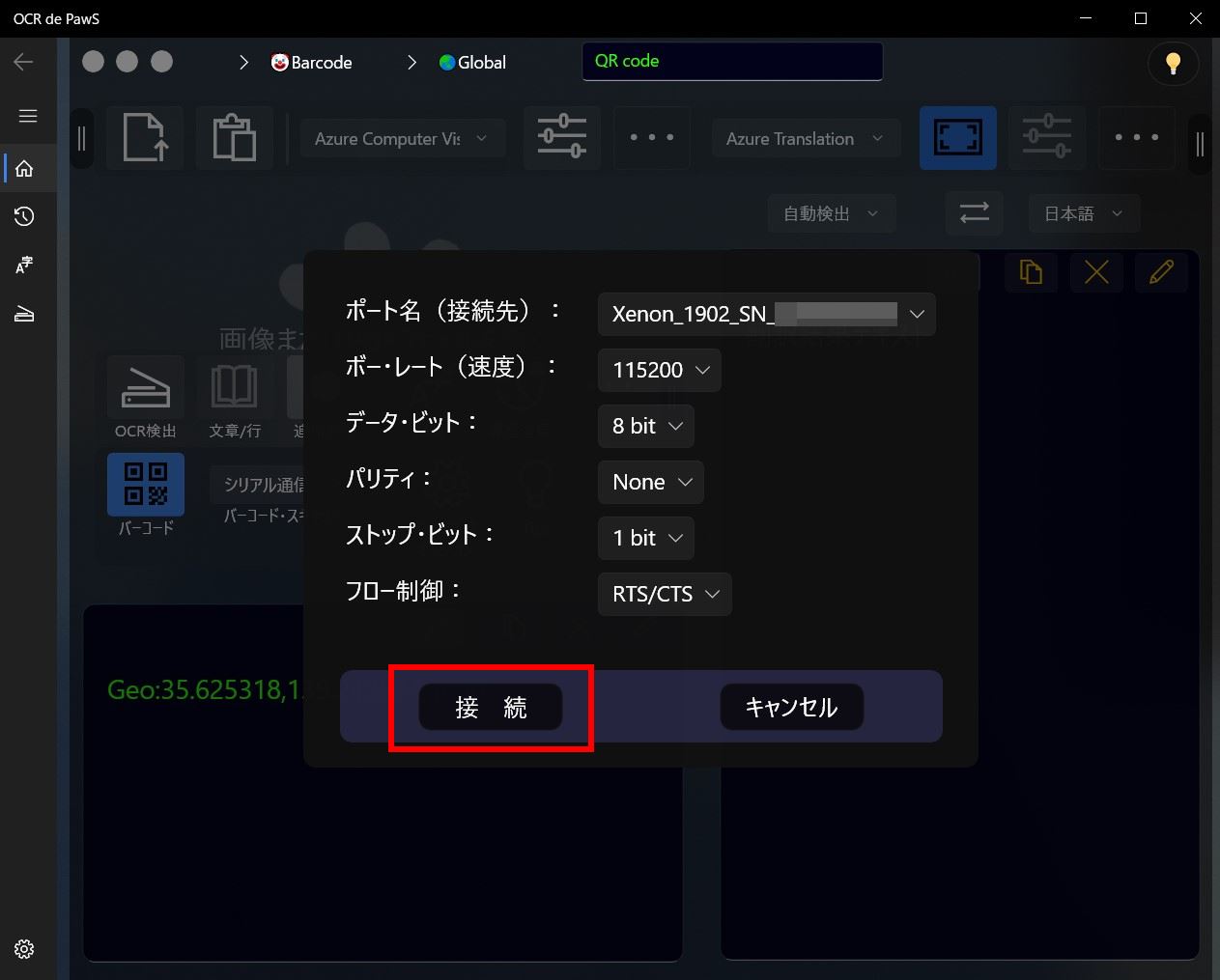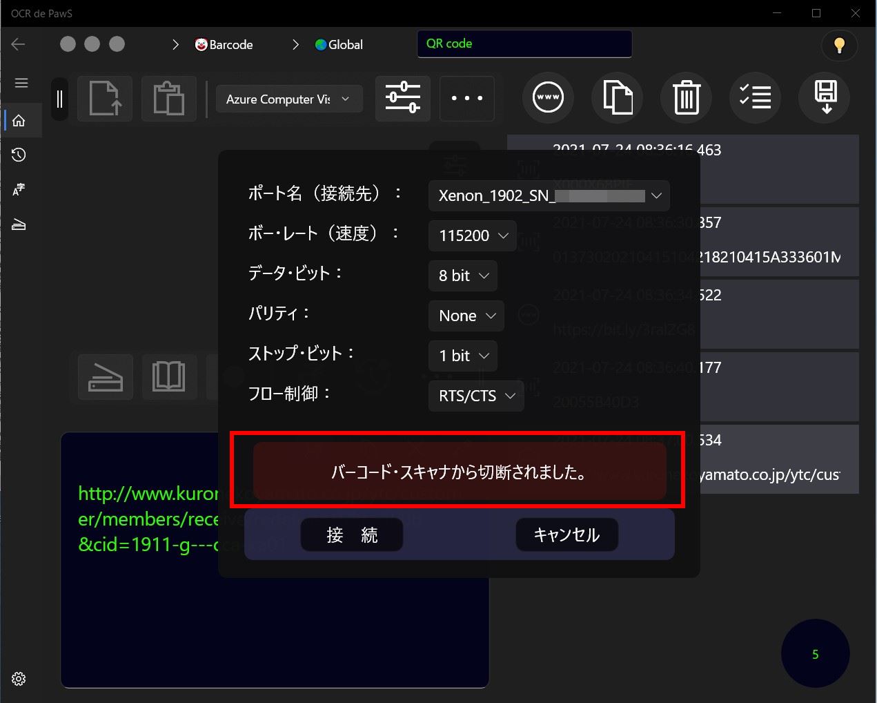 ④ バーコード・スキャナーの電源がアクティブになっていることを確認し、接続ボタンをクリックして下さい。